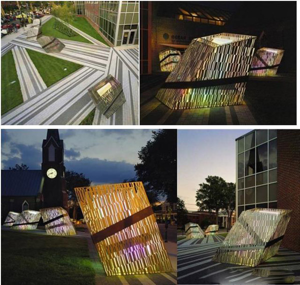 美國Mikyoung Kim完成了新澤西州海洋縣公共圖書館門前的一系列景觀照明設計。這個由激光切割不銹鋼和玻璃構成的景觀燈具,應用了條碼圖案來表達在數(shù)字時代下信息的傳播。五個一組的燈具被用激光切割成的鋼鐵包裹在一起,它們既能反射光線,又能從內部發(fā)出光芒,從白天到黑夜都有變化。